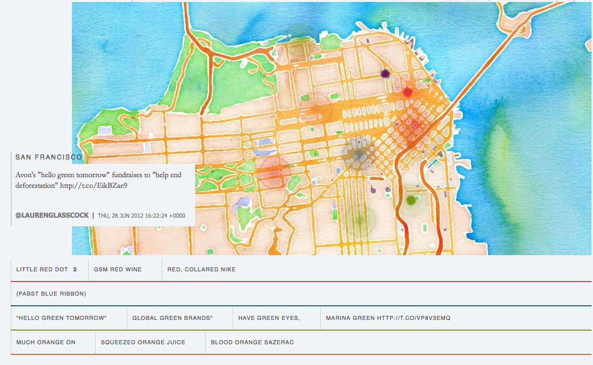 Unir tuítes que citam cores com seus locais de origem. O Color Coordinates é um belo desdobramento do projeto Watercolor Maps, ferramenta de geolocalização que apresenta mapas com outras tintas.
